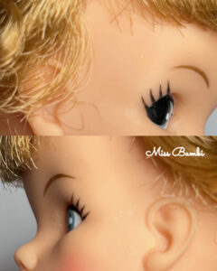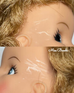 このお仕事をしているとお人形さんによってデフォルトでここに傷があるみたいなことがわかってくるのですが、アメリカ製タミーちゃんは結構な確率でこめかみに傷があるんです。今回はそれを消してほしいというオーダーです。