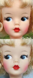 アメリカ製タミーちゃんのお顔はほぼ手書きですので個体差が非常に大きいです。想像するに当時の工場での作業はこのお顔を書く作業もスピード勝負だったのではないでしょうか。たくさんのタミーちゃんを見ていると描き方に特徴がそれぞれあり、これはあのタミーちゃんと同じ人が描いたのではないかなどと思いを馳せたりします。